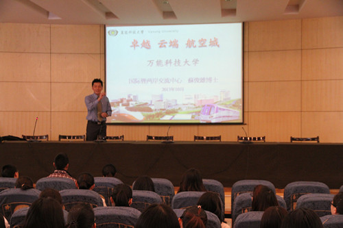 3月25日上午,台湾万能科技大学在我校图书馆一楼学术报告厅召开赴台学生学习交流会。台湾万能科技大学观光与休闲事业系助理教授、国际暨两岸交流中心主任蘇俊雄博士,国际交流合作处副处长张国奎,副院长高亚芳教授和我院音乐表演专业(空中乘务方向)学生200余人参加了交流会。