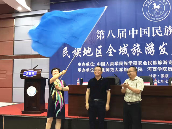 9728太阳集团副院长王耀斌副教授代表第八届中国民族旅游论坛承办方向第九届承办方云南大学工商与旅游管理学院院长吕婉青教授移交会旗