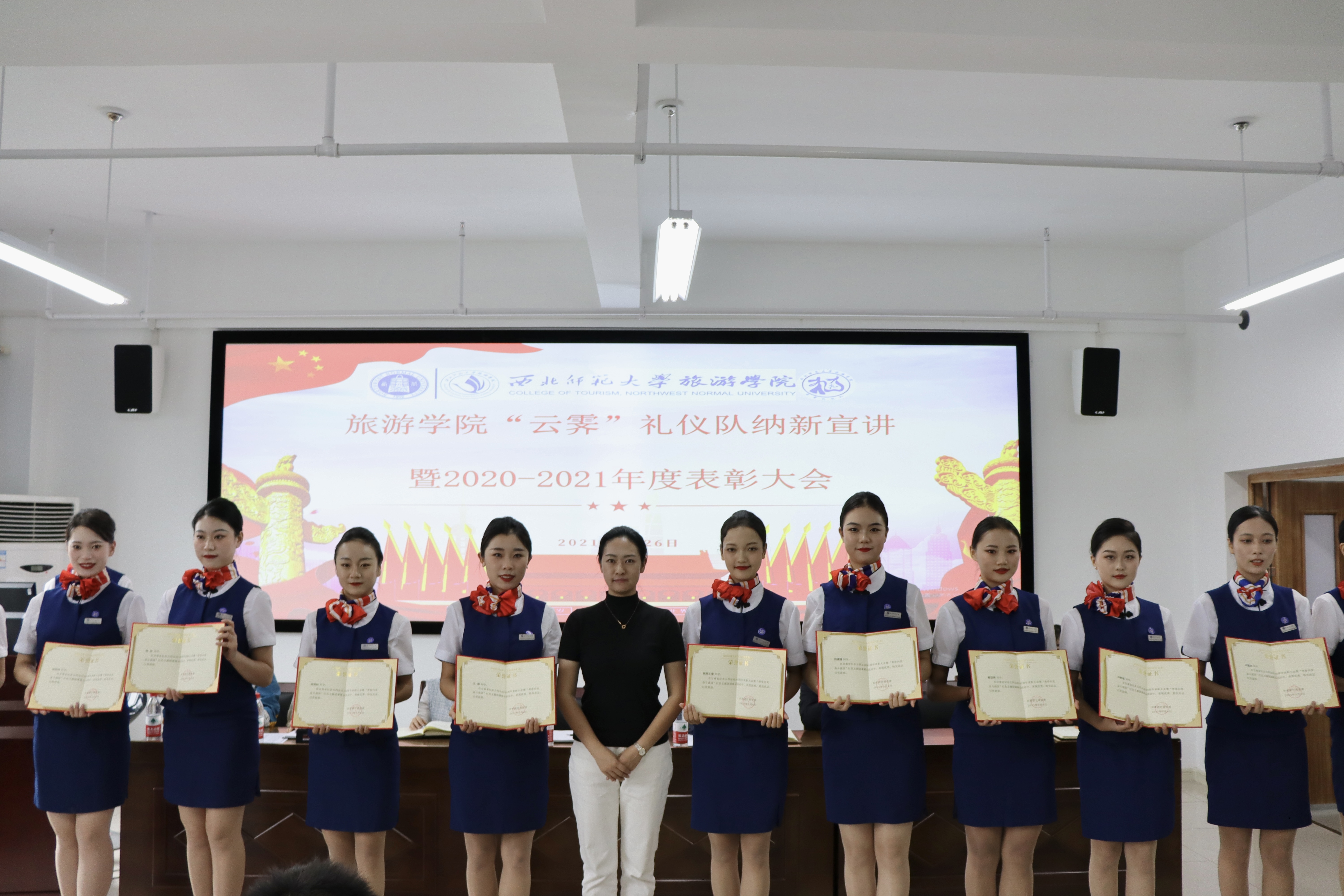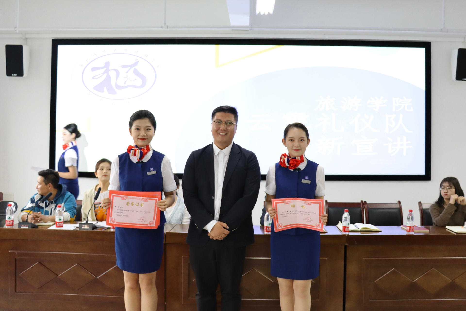会上,戴小武为“云霁”礼仪队队长、队干颁发聘书;席聪、梅天鹏、岑诺、邹小强、鲁梦鸽分别颁发“五四青年奖”、优秀队干奖、先进个人奖、优秀队员奖、部门优秀队员等荣誉证书,同时为全体队员颁发聘书。席聪向2021级新生做专业认知讲解;礼仪队队长朱诺进行纳新宣讲。