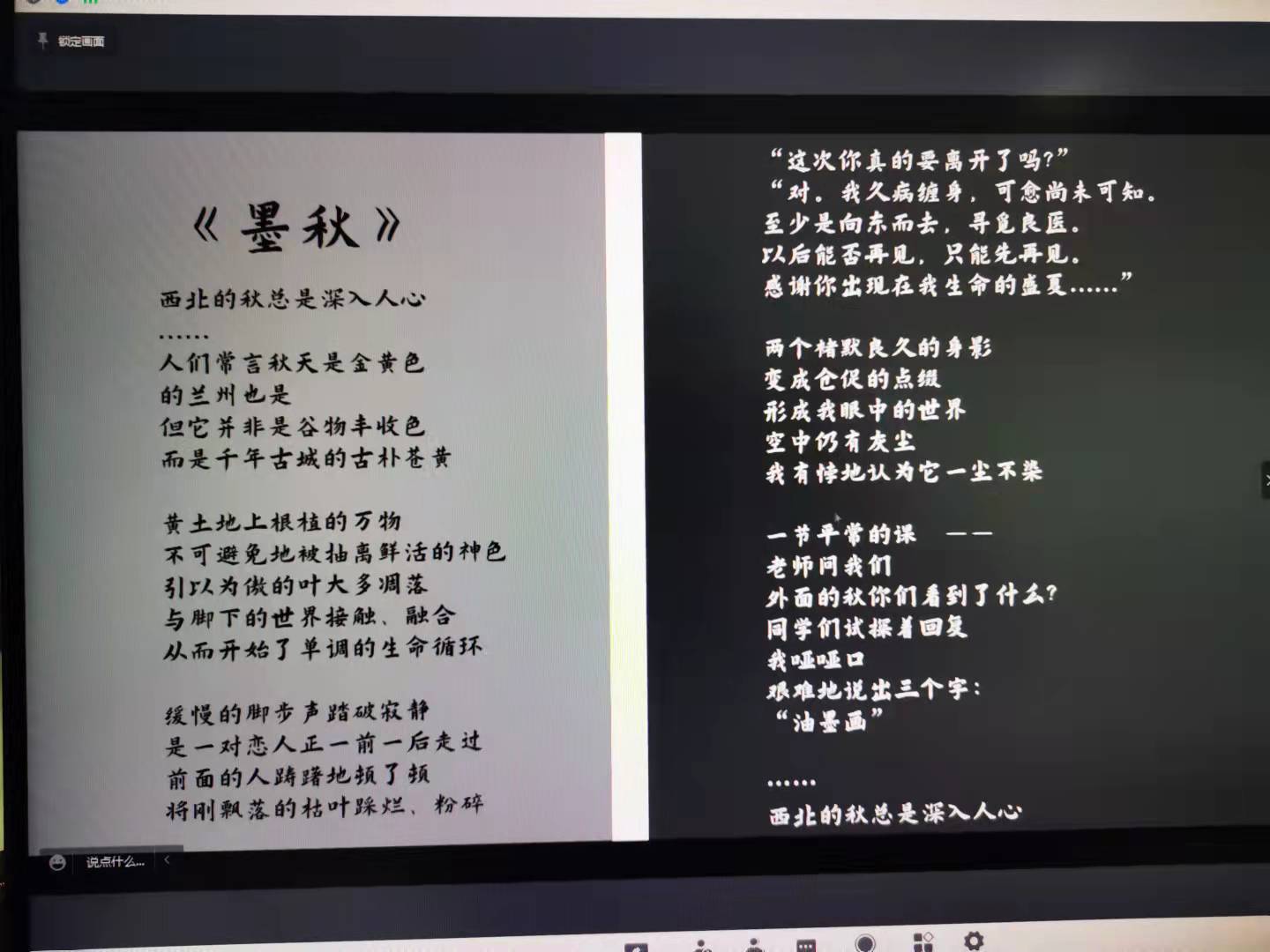 杨顺驰同学分享了自己的两首诗《墨秋》与《执眼》。关于《墨秋》,他介绍到自己在老师课堂上的回答:兰州的秋像一幅油墨画,西北的秋总是深入人心;关于《执眼》,他谈起了自己这首诗背后的青春故事,引发了书友们的青春追思与讨论。