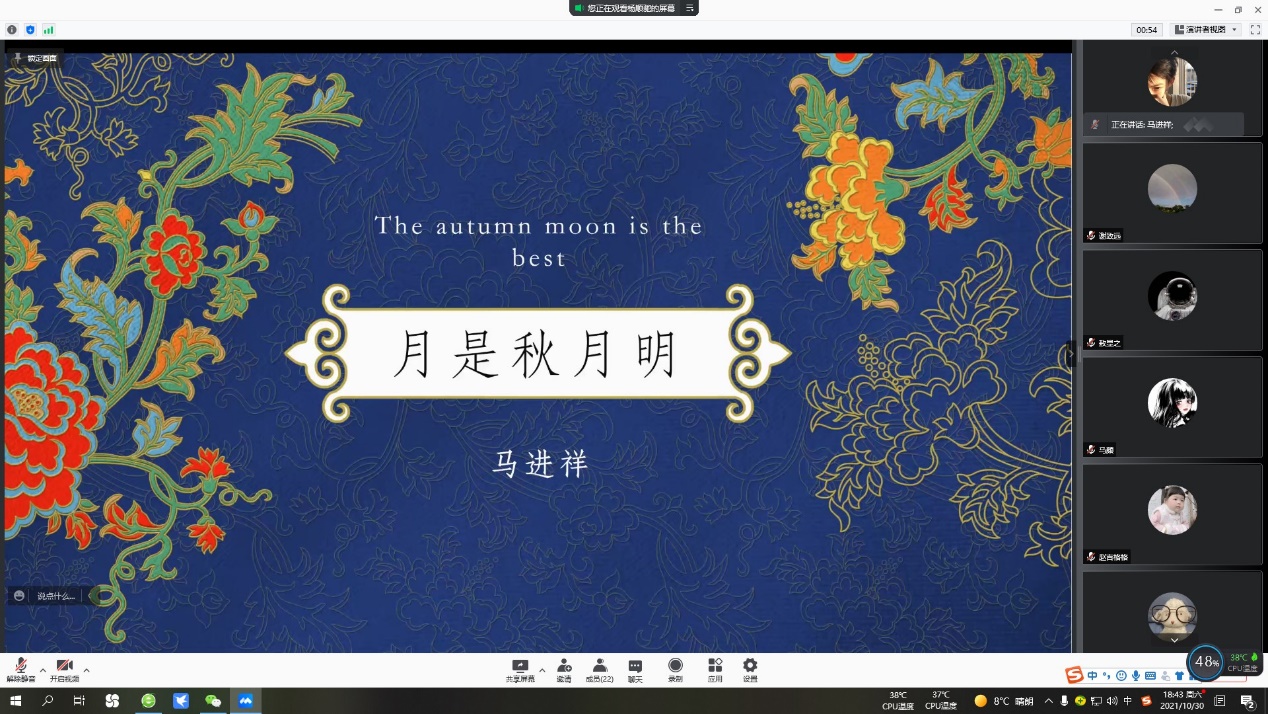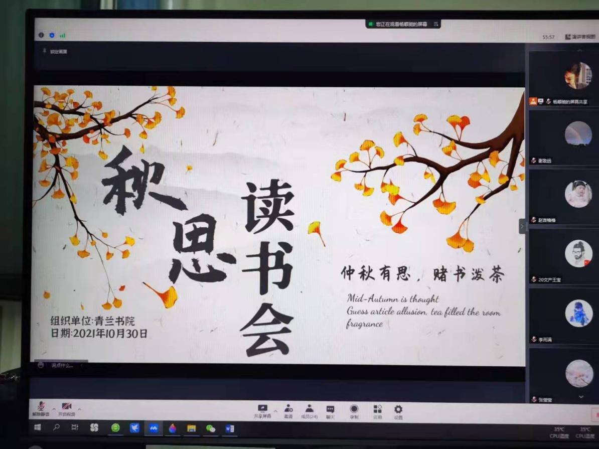 深秋时节,天高云淡,秋风送爽。一场突如其来的疫情打断了大家的正常生活,9728太阳集团青兰书院通过腾讯会议举办了以 “秋思”为主题的读书分享会。9728太阳集团党委书记谢致远老师以及2019、2020和2021级的部分本科生积极参与了本次活动。