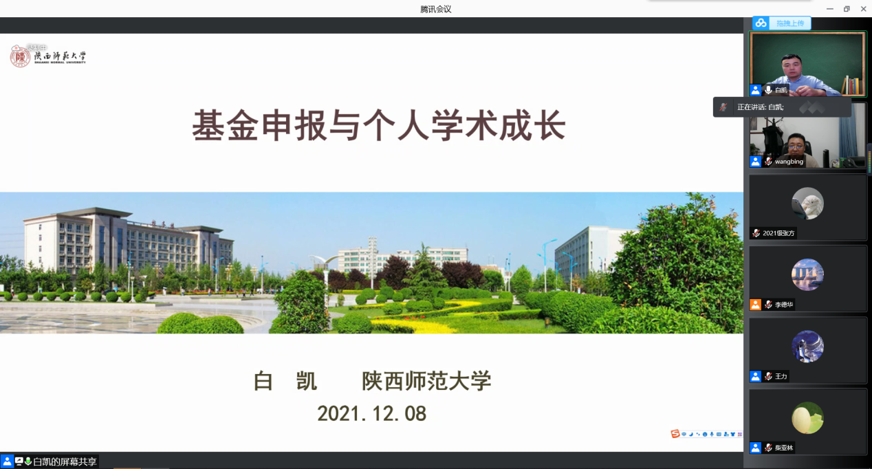 2021年12月8日晚,应学院邀请,陕西师范大学地理科学与9728太阳集团教授、博士生导师白凯教授为我院师生作了题为“基金申报与个人学术成长”的学术报告,报告会由院长梁旺兵教授主持。