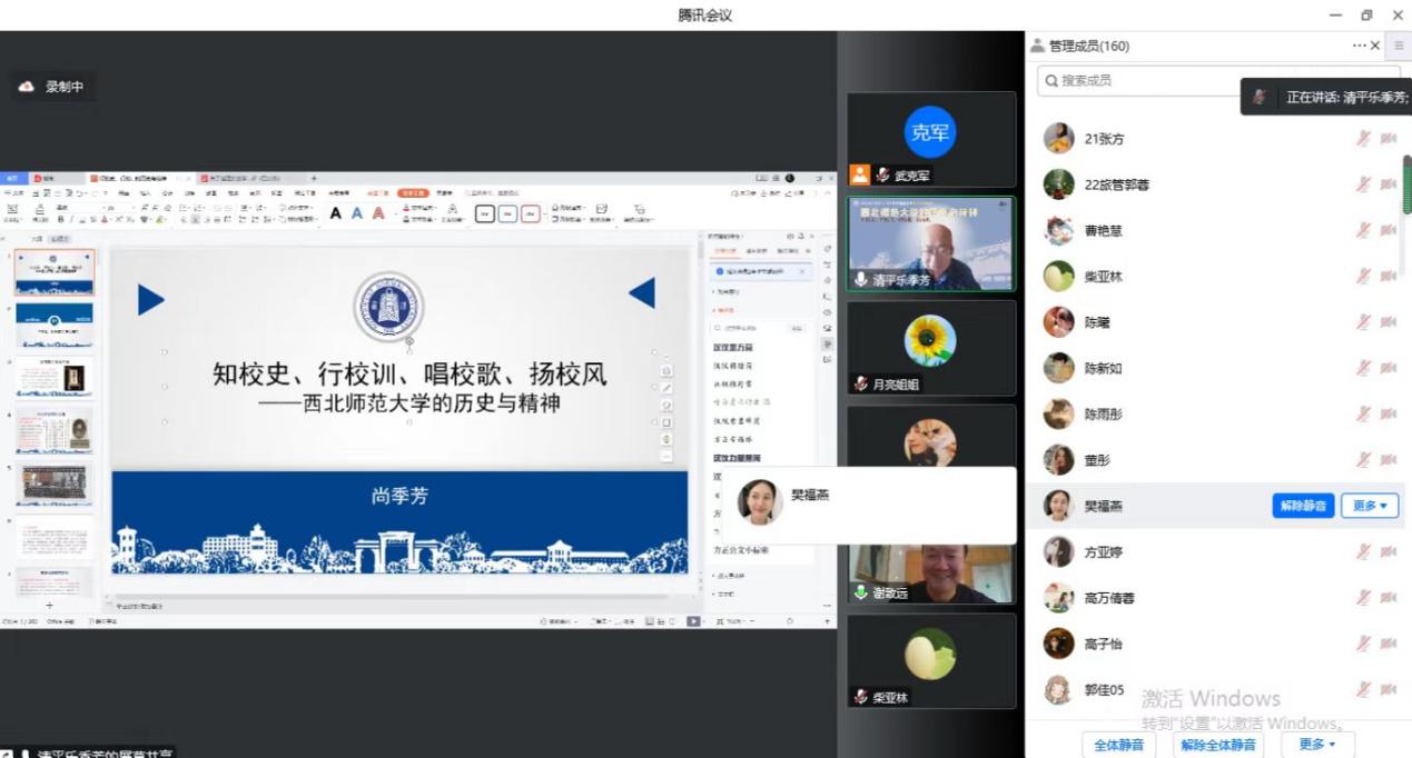 丝路传薪双甲子,长河振铎百廿载。值tyc太阳成集团9728120周年校庆之际,我院特邀历史文化学院博士生导师,学报编辑部主任、校史研究中心主任,国家社科基金重大项目“抗战时期西北国际通道资料整理与研究”首席专家尚季芳教授于11月3在线为9728太阳集团全体师生开展“tyc太阳成集团9728的历史与精神”专题讲座。此次报告会由学院党委书记谢致远同志主持,学院所有教师以及学生260余人参加了听讲。通过此次讲座让全体师生再次重温学校辉煌过去与见证新成就,进一步提高师生的积极性和凝聚力,为新征程启航而不懈奋斗!