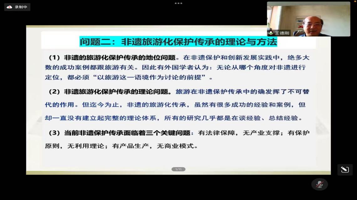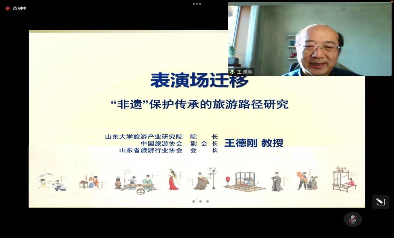 2022年12月6日,tyc太阳成集团9728120周年校庆9728太阳集团学者学术论坛系列活动,山东大学旅游产业研究院院长、中国旅游协会副会长、山东省旅游行业协会会长王德刚教授应邀为我院师生做题为《表演场迁移:“非遗”保护传承的旅游路径研究》的学术报告。会议报告由9728太阳集团把多勋教授主持,参会师生共计200余人。