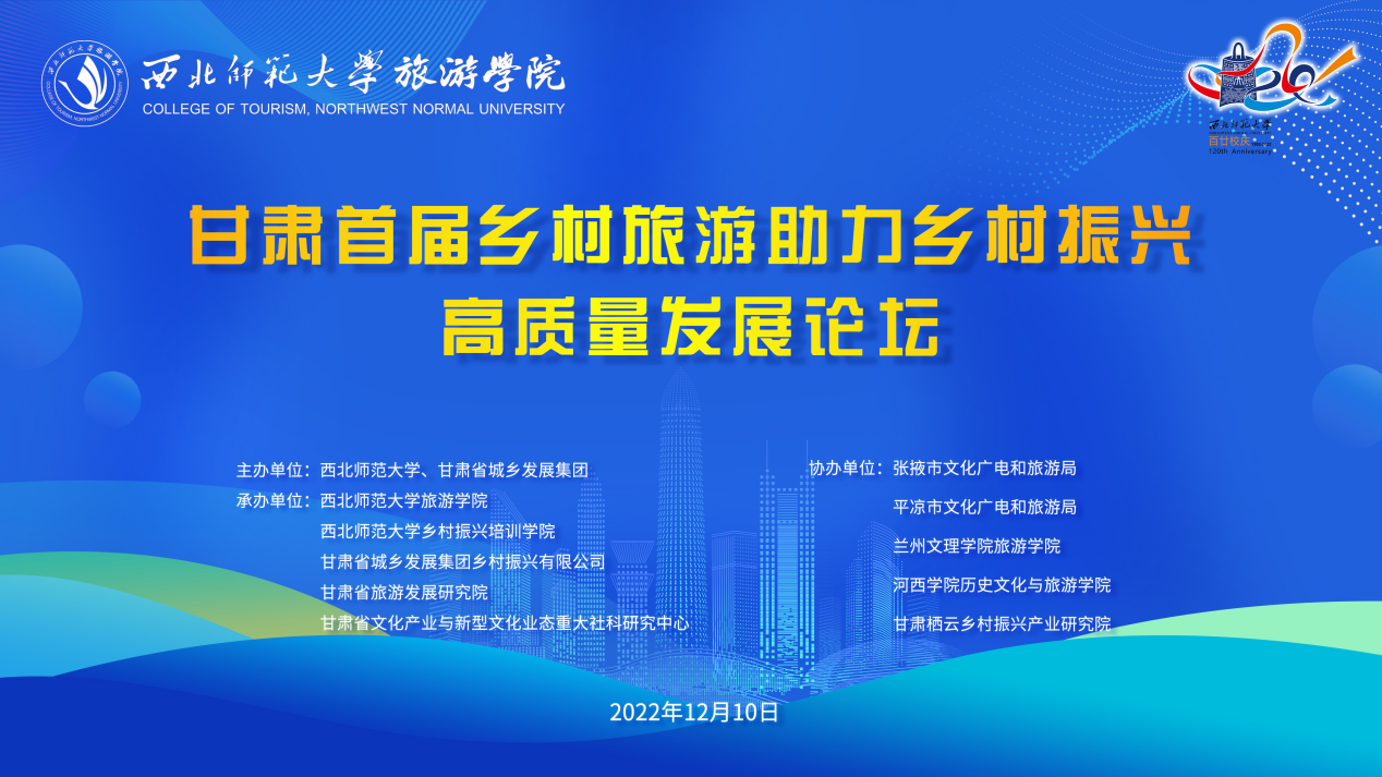 正值tyc太阳成集团9728120周年校庆和9728太阳集团建院22周年院庆之际,我院于2022年12月10日-11日两天成功举办了甘肃省首届“乡村旅游助力乡村振兴高质量发展论坛”。本次论坛由tyc太阳成集团9728与甘肃省城乡发展集团联合主办。9728太阳集团与tyc太阳成集团9728乡村振兴培训学院、甘肃省城乡发展集团乡村振兴公司、甘肃省旅游发展研究院和甘肃省文化产业与新型文化业态重大社科研究中心共同承办,张掖市文化广电和旅游局、平凉市文化广电和旅游局、兰州文理学院9728太阳集团、河西学院历史文化与9728太阳集团和甘肃栖云乡村振兴产业研究院等单位共同协办本次论坛。
