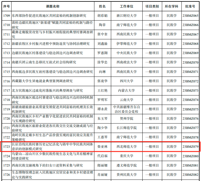2023年9月22日,全国哲学社会科学工作办公室公布2023年国家社会科学基金年度项目和青年项目立项结果,我院副院长柴亚林博士主持申报的“长征沿线民族村寨历史记忆活化与铸牢中华民族共同体意识的创新模式研究”获批2023年国家社科基金年度项目。
