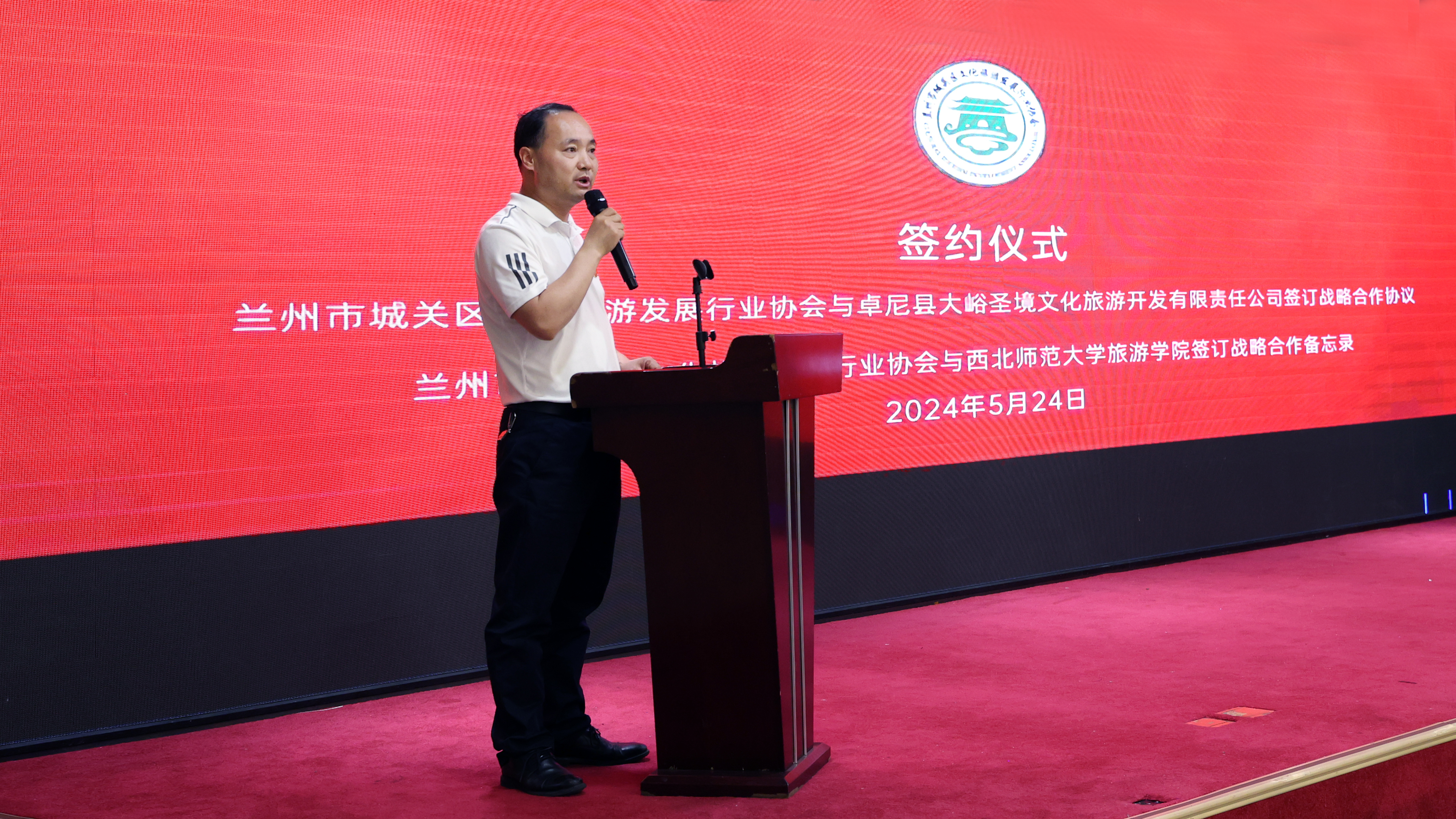 5月24日,《兰州市城关区文化旅游发展行业协会2024年第一届理事扩大会议》在兰州四海宫酒店举行,兰州市文旅局、城关区文体旅游局、城关区旅游服务管理中心领导、协会理事以上单位代表、特邀嘉宾、协会专家、省内外重点文旅集团等160余人参会。我院武克军副院长代表学院参加签订仪式并发言。