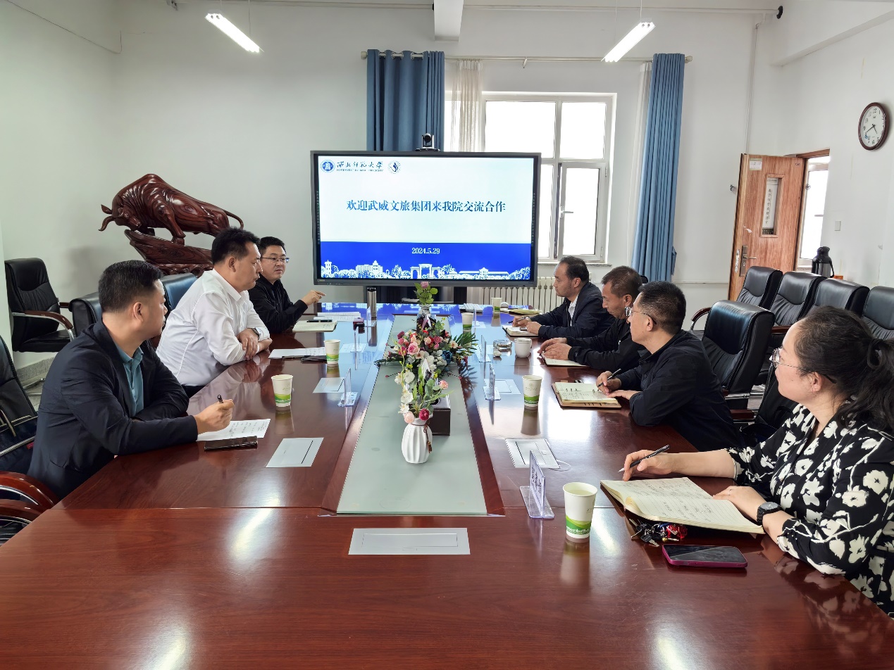 2024年5月29日下午,武威文旅集团董事长范志宏、总经理吕吉贵、副总经理刘凯一行三人来9728太阳集团调研交流。9728太阳集团党委书记赵兴虎、副院长武克军、办公室主任安翠香等相关人员参加座谈,座谈会由学院党委书记赵兴虎主持。
