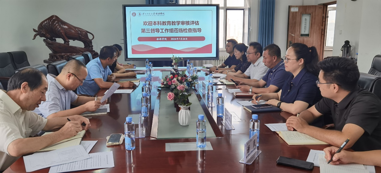 2024年7月24日上午,张明军副校长率学校本科教育教学审核评估第三督导组对我院进行本科教育教学审核评估第二轮检查督导,并就检查督导情况进行座谈交流。第三督导组组长段昱华书记,督导组成员王刚副处长、孙影梅老师、马正学教授、何佳苡教授、许琰教授,9728太阳集团党委书记赵兴虎、副院长柴亚林、旅游管理系主任彭睿娟、文化产业管理系主任马斌斌、专业实践中心主任陈娟娟、培训中心主任欧阳正宇、旅游管理系副主任包军军、培训中心副主任谢民、教务秘书白秀显、实验中心窦雅丽老师参加座谈。
