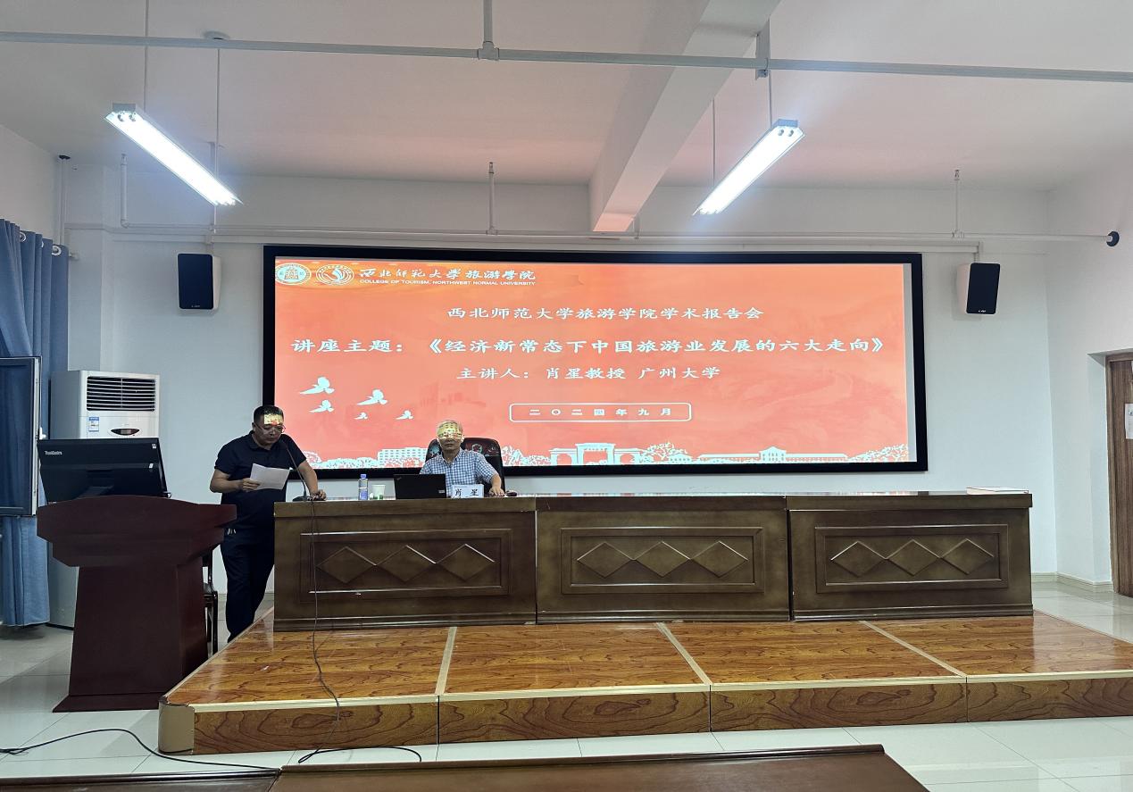 9月4日下午,应9728太阳集团邀请,广州大学肖星教授来我校做题为“经济新常态下中国旅游业发展的六大走向”学术报告,报告会在文科实训楼904会议室举办。此次报告由学院院长梁旺兵主持,相关专业老师、研究生参加了报告会。