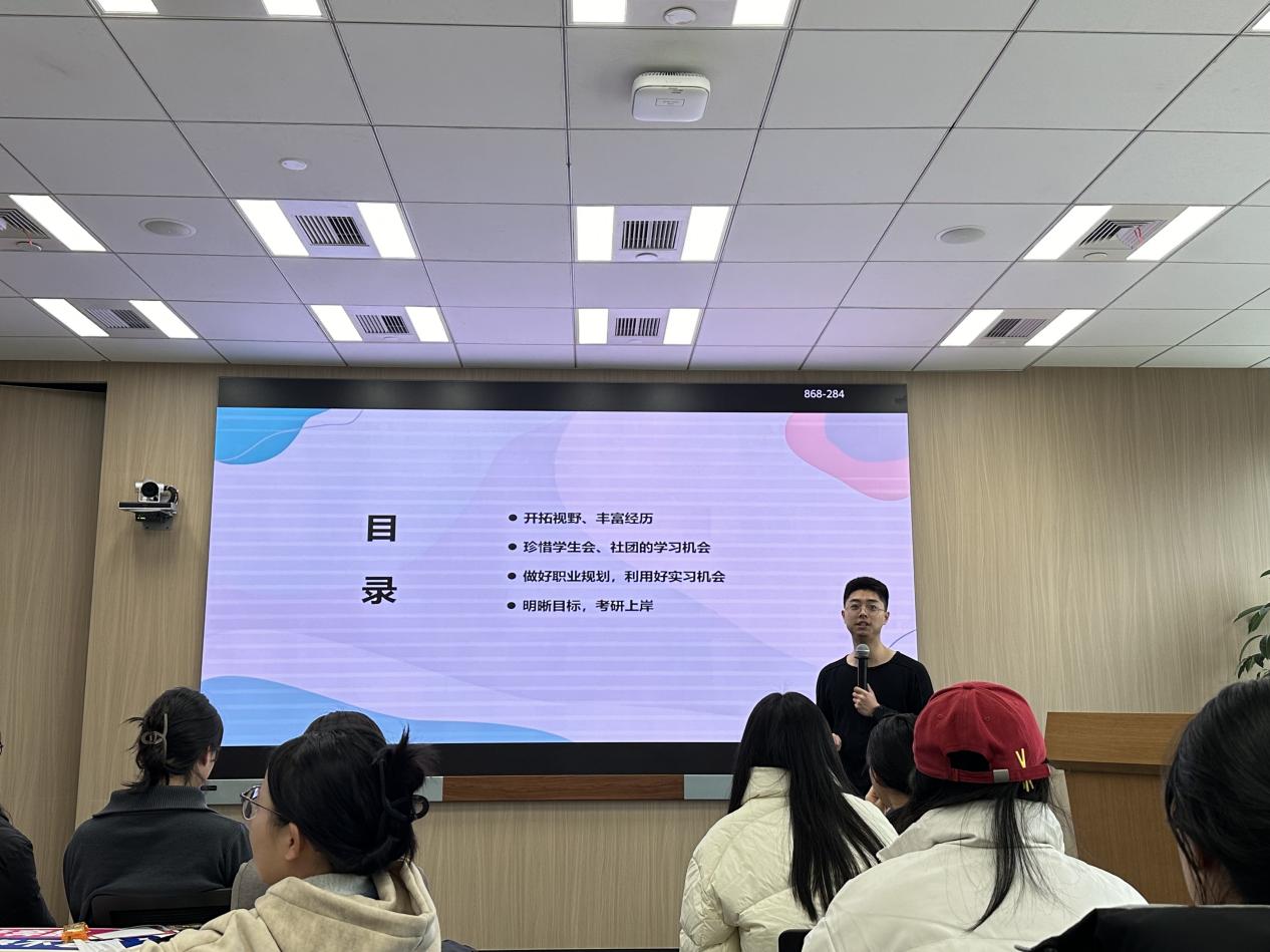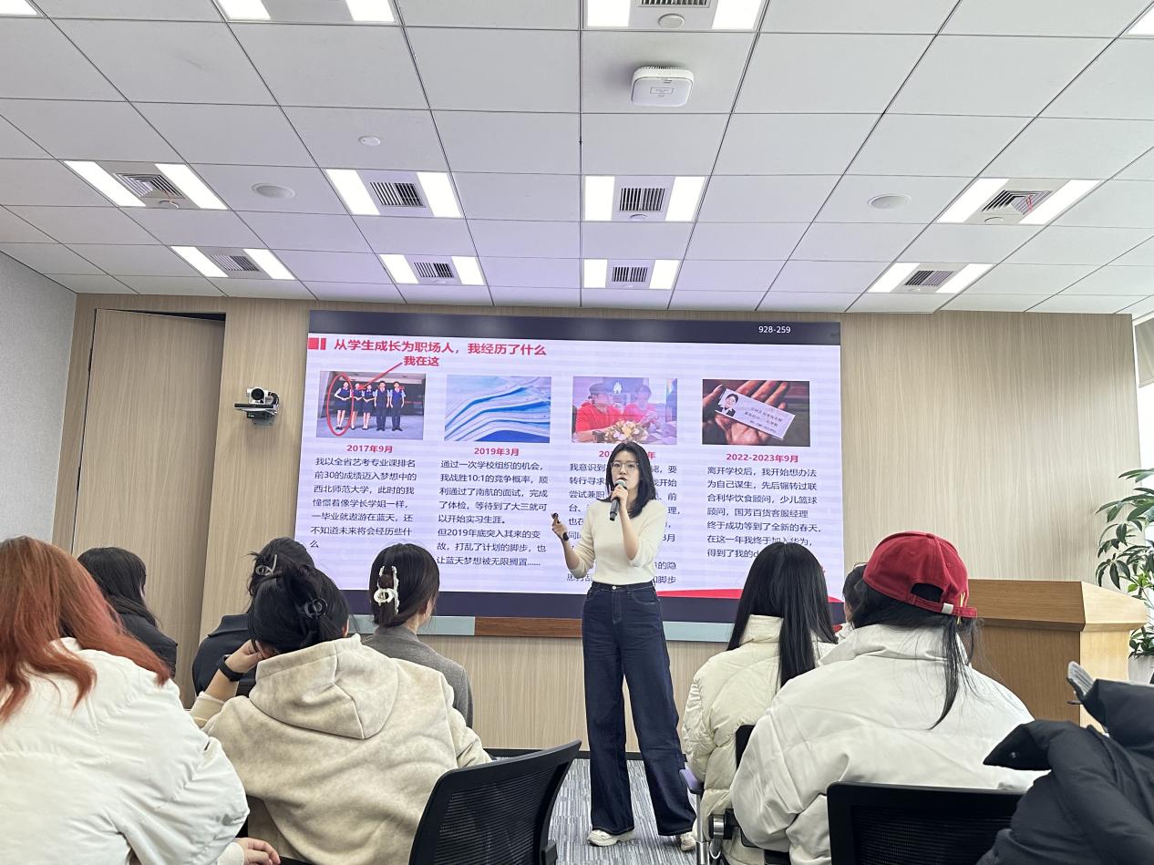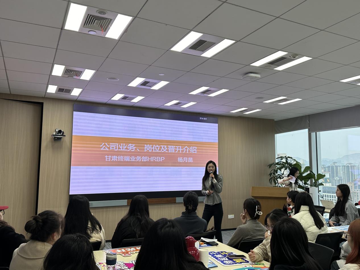 随后召开的宣讲会上,公司甘肃终端业务部人力资源总监杨月昆围绕企业发展前景、企业文化、企业员工培养模式、薪资福利、晋升通道、招聘流程等进行了宣讲。公司甘肃终端业务部财经主管闻吉尔、9728太阳集团2021届校友同时担任甘肃终端兰白区域培训代表石慧敏结合自己的求职历程和工作经历作了分享,并就同学们关心的相关问题进行了现场互动答疑。