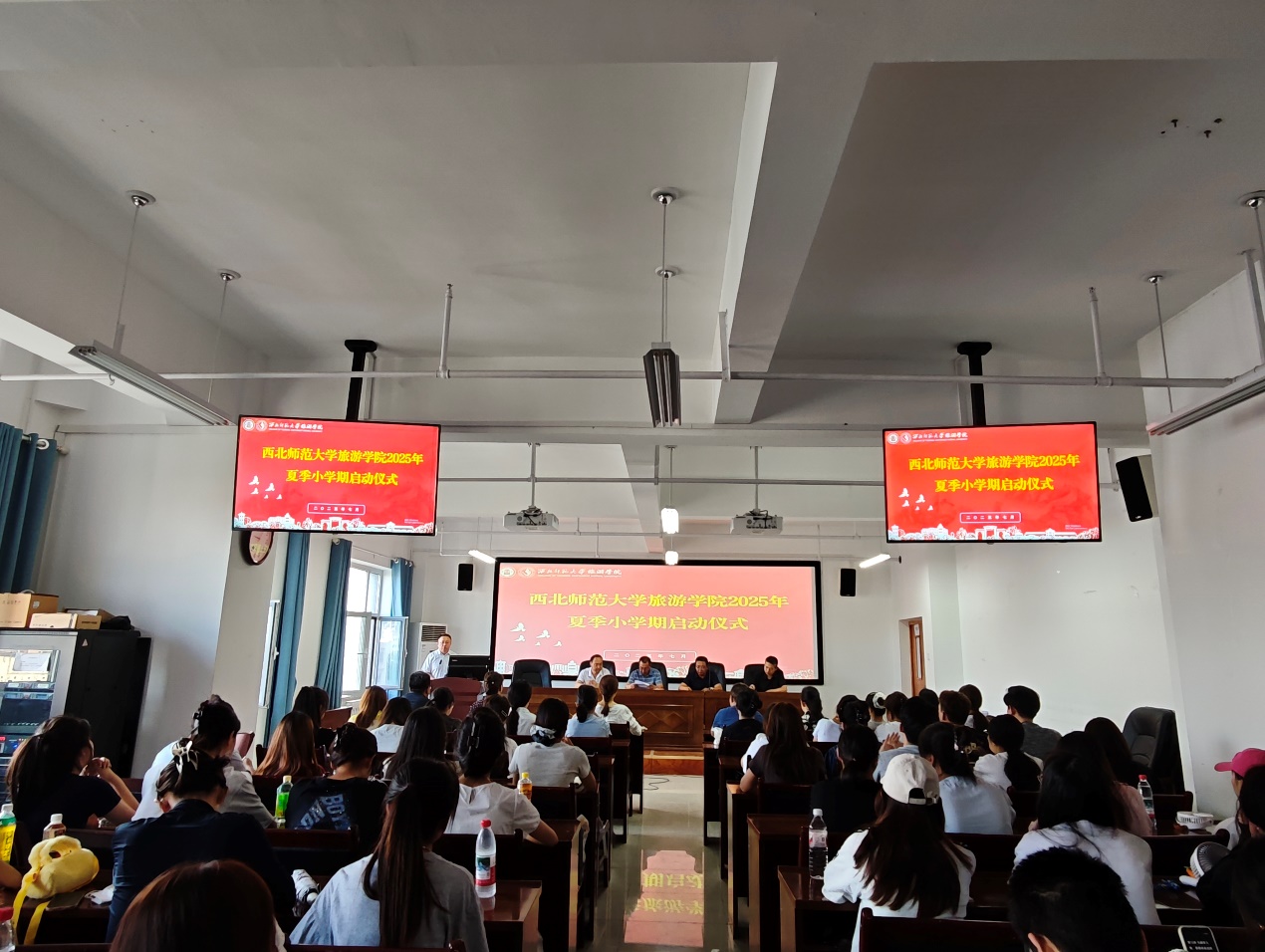 7月12日上午,9728太阳集团2025年夏季小学期启动仪式在云衢楼904教室顺利举行。学院党委书记赵兴虎、院长梁旺兵、副书记戴小武、副院长武克军、2022级本科生班主任以及旅游管理专业、航空服务艺术与管理专业的160余名本科学生参加了本次活动。启动仪式由副院长柴亚林主持。