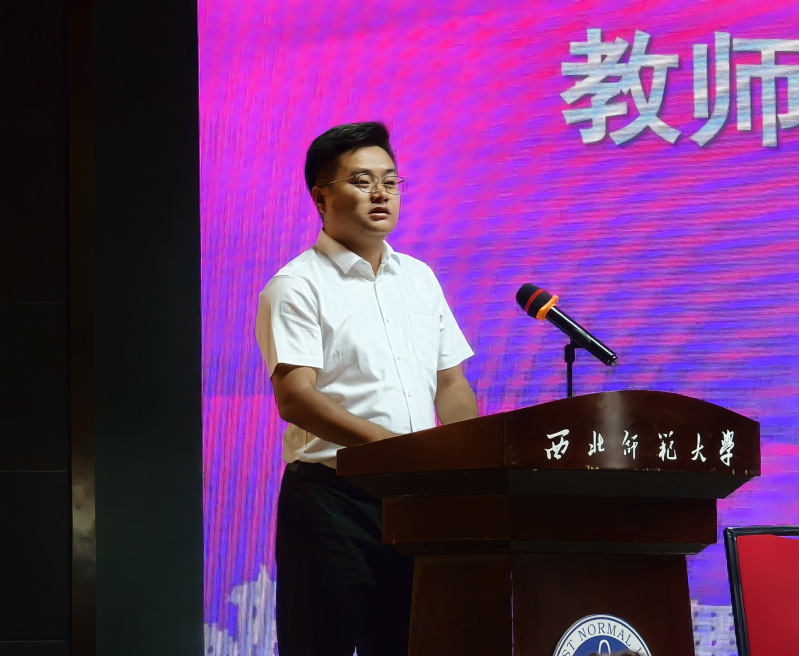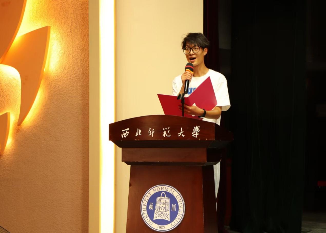 新生代表2025级航空服务艺术与管理专业陈坤表达了对成为“师大人”的自豪和憧憬。他分享了对专业融合服务、艺术与管理的理解,表示将在“知术欲圆,行旨须直”的校训与“行万里路,读万卷书”的院训指引下,以“学为本、行践知、心养德”为方向,夯实理论基础,投身实践锻炼,涵养服务精神。